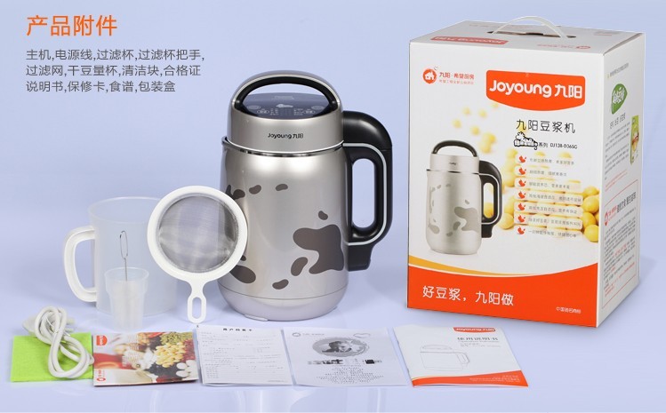产品名称:九阳 家电品牌:九阳 容积:1L-1.5L 豆浆机功能:干豆 湿豆 米糊 五谷 果蔬 玉米汁 绿豆 杯体材质:不锈钢杯体 是否有网:有 豆浆机功率:751-1000W 售后服务:全国联保豆浆机 加热方式:立体环绕加热 自动清洗功能:有 适用人数:4-5人