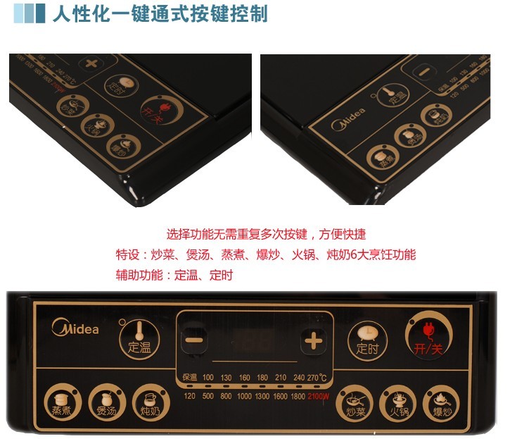 产品名称:Midea/美的 WK2101 电磁炉品牌:Midea/美的 型号:WK2101 货号:WK2101 颜色分类:黑色 电磁炉炉头:单炉 功能选择:爆炒 炒菜 蒸煮 煮粥 煲汤 火锅 烧水 煎炸 定温 定时 电磁炉面板类型:黑色微晶面板 磁炉功率:2001-3000W 售后服务:全国联保 操作方式:按键式 能效等级:3级 火力档位:8档 预约功能:无 防水功能:有