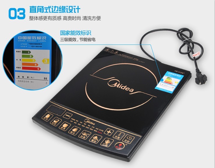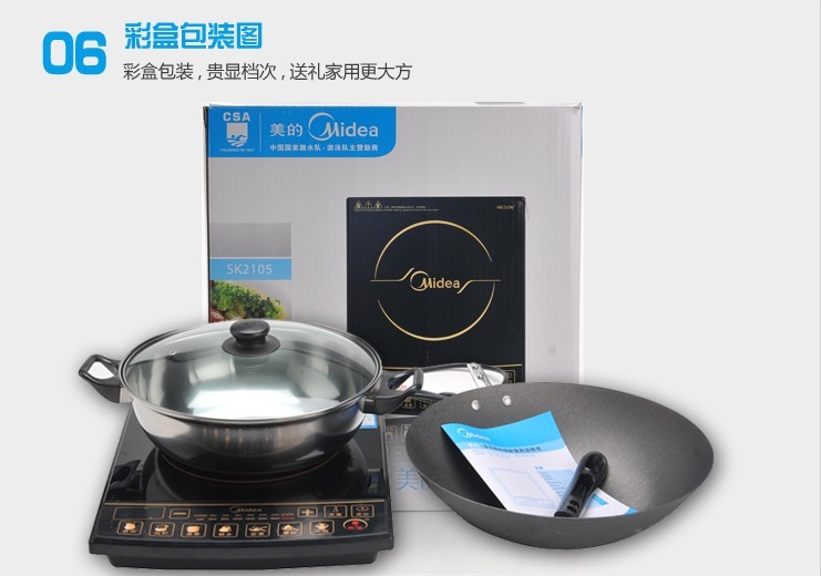 产品名称:Midea/美的 SK2105 电磁炉品牌:Midea/美的 型号:SK2105 货号:JYC-21ES70 颜色分类:黑色 电磁炉炉头:单炉 功能选择:爆炒 炒菜 炖奶 蒸煮 煮粥 煲汤 火锅 电磁炉面板类型:黑色微晶面板 磁炉功率:2001-3000W 操作方式:按键式 能效等级:3级 火力档位:8档 预约功能:无 防水功能:无