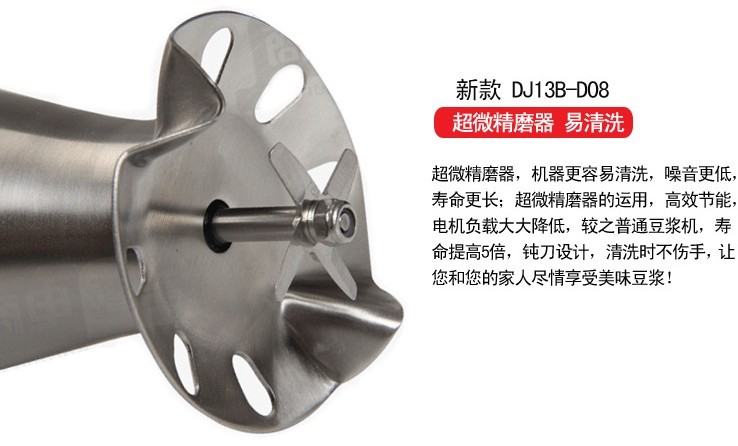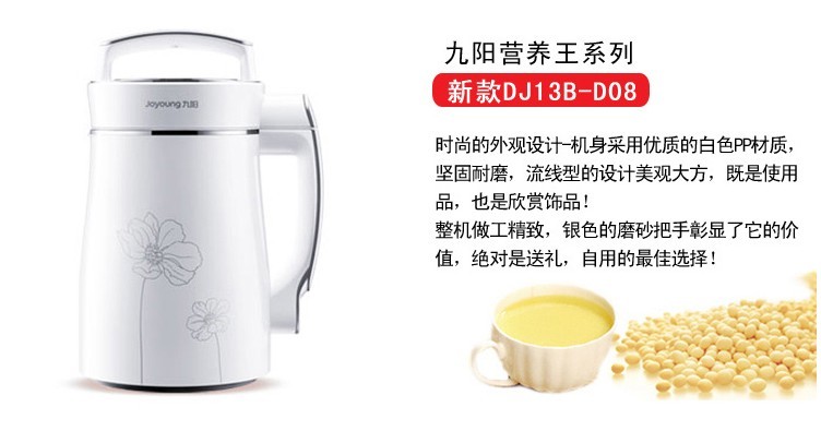 产品名称:九阳 家电品牌:九阳豆浆机 型号:DJ13B-D08 容积:1L-1.5L 豆浆机功能:干豆 湿豆 五谷 果蔬 杯体材质:不锈钢杯体 是否有网:有网 豆浆机功率:750W及以下 豆浆机加热方式:底盘加热 自动清洗功能:有 适用人数:4-5人
